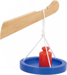 Waga ma naturalny drewniany wygląd z czerwonymi i niebieskimi akcentami, które czynią ją wizualnie atrakcyjną dla każdego dziecka.
