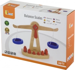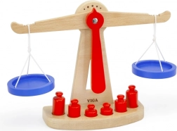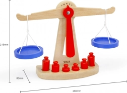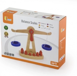 Drewniana waga balansowa marki Viga jest wyposażona w dwie niebieskie misy zawieszone na sznurkach i zawiera sześć czerwonych odważników o różnych rozmiarach. Dzięki swojemu kolorowemu designowi i bezpiecznemu wykończeniu ta waga dostarcza dzieciom wiele zabawy. Waga została zaprojektowana tak, aby motywować dzieci do używania wyobraźni i fantazji podczas zabawy w sklep, co pomaga im zrozumieć podstawowe koncepcje matematyczne i wartość równowagi.