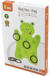 W zestawie drewniana płyta w kształcie żaby i 6 kółek – wystarczy rozpakować i zacząć rzucać.