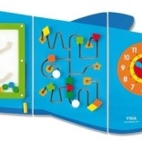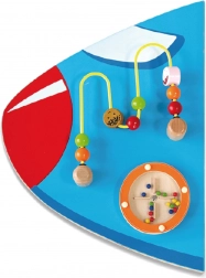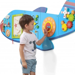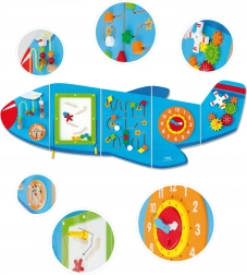 Drewniana tablica ścienna Samolot marki VIGA jest wielofunkcyjną zabawką, składającą się z pięciu części, które razem tworzą kształt samolotu. Każdy element oferuje inny rodzaj aktywności dla zabawnego rozwoju umiejętności dzieci: