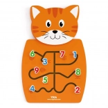 Drewniany kot z labiryntami do przesuwania liczby i rozwijania małej motoryki.