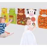 Tablica manipulacyjna w kształcie Kota z wyciętymi labiryntami na brzuszku.