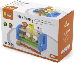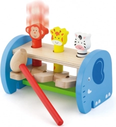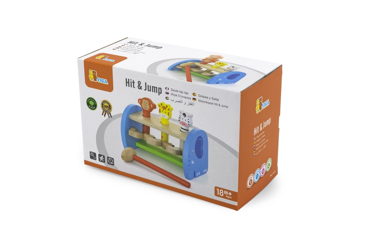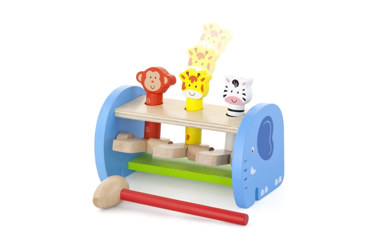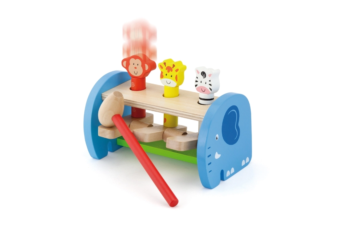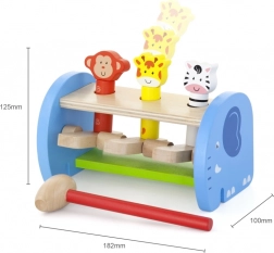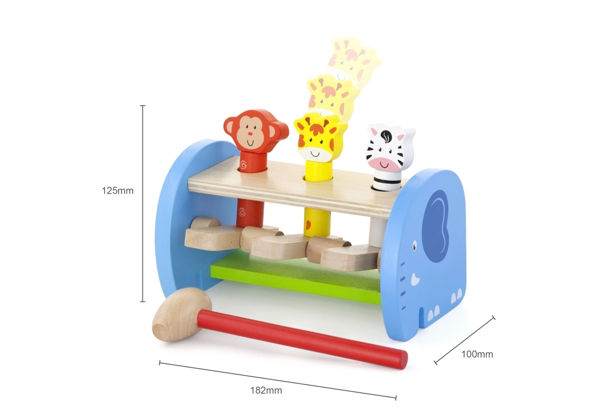 Ta wysokiej jakości drewniana zabawka oferuje bezpieczną i kolorową zabawę z uroczymi zwierzątkami. Dzieci za pomocą młoteczka stukają w mechanizm, który sprawia, że zwierzątka wyskakują – doskonalą w ten sposób chwyt, siłę ścisku i precyzję ruchu. Solidna konstrukcja i gładkie krawędzie zapewniają bezpieczeństwo podczas codziennego użytkowania.