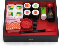 Zestaw zawiera różne drewniane kawałki sushi, pałeczki, pojemnik na sos sojowy oraz tacę do serwowania, które doskonale imitują autentyczne doznania podawania sushi. To świetny sposób na zapoznanie dzieci z różnymi rodzajami jedzenia i nauczenie ich podstawowych umiejętności japońskiej kuchni.