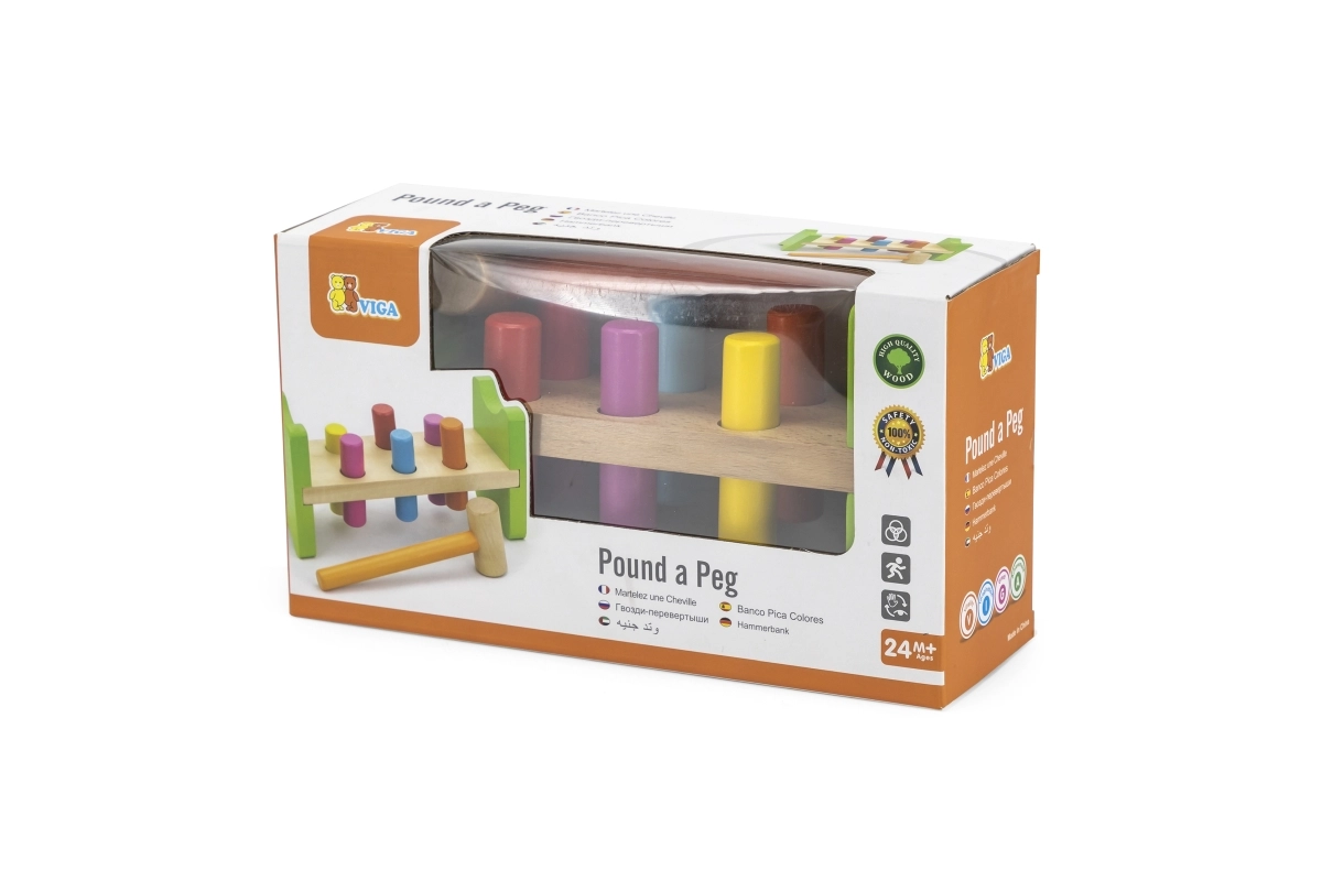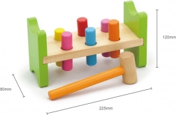 W zestawie znajduje się drewniany młotek i wielobarwne kołki dla długotrwałej zabawy.