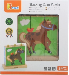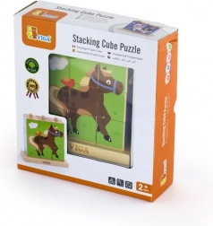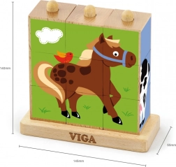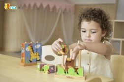 Z 9 kostek ułożycie 4 różne motywy – krówkę, kurkę, konika i pieska. Dzieci ćwiczą percepcję wzrokową, rozróżnianie kolorów i trenują cierpliwość.