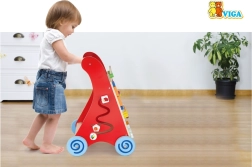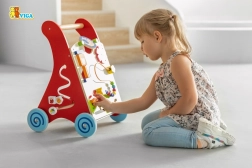 Szeroko rozstawione kółka z gumową powierzchnią chronią podłogę i zwiększają stabilność, a drewniany uchwyt dobrze leży w dziecięcej dłoni. Produkt wykonany jest z lakierowanego drewna, a lakiery i farby spełniają normy EN71 i ASTM. Idealna domowa pomoc w rozwoju motoryki, cierpliwości i wyobraźni.
