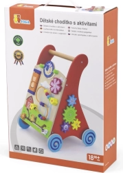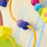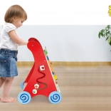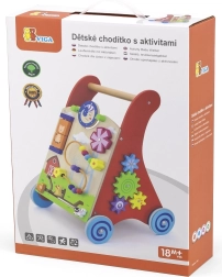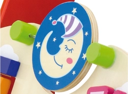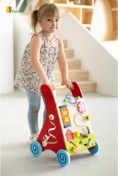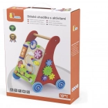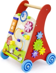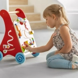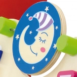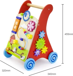 Ten wysokiej jakości drewniany chodzik z centrum aktywności łączy wsparcie podczas nauki chodzenia z bogatymi bodźcami sensorycznymi. Przedni panel oferuje obrotowe elementy ze słońcem i księżycem, kręcący się wiatraczek, pięciokoralikową pętelkę motoryczną, obrotowy dysk z kotkiem oraz przesuwane zwierzątka (krówka, piesek, konik) poruszające się po torze do stodoły. Boki uzupełniają zębate kółka oraz tor z pszczółką, biedronką i ślimakiem.