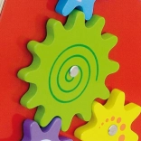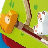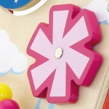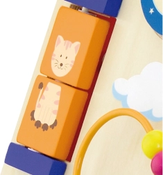 Obrotowe elementy, przesuwane zwierzątka, koralikowa pętelka i wiatraczek wspierają małą motorykę, cierpliwość oraz rozumienie przyczyn i skutków.