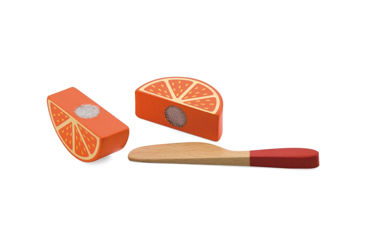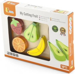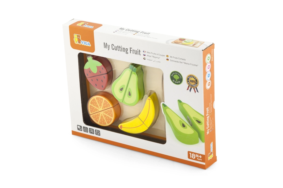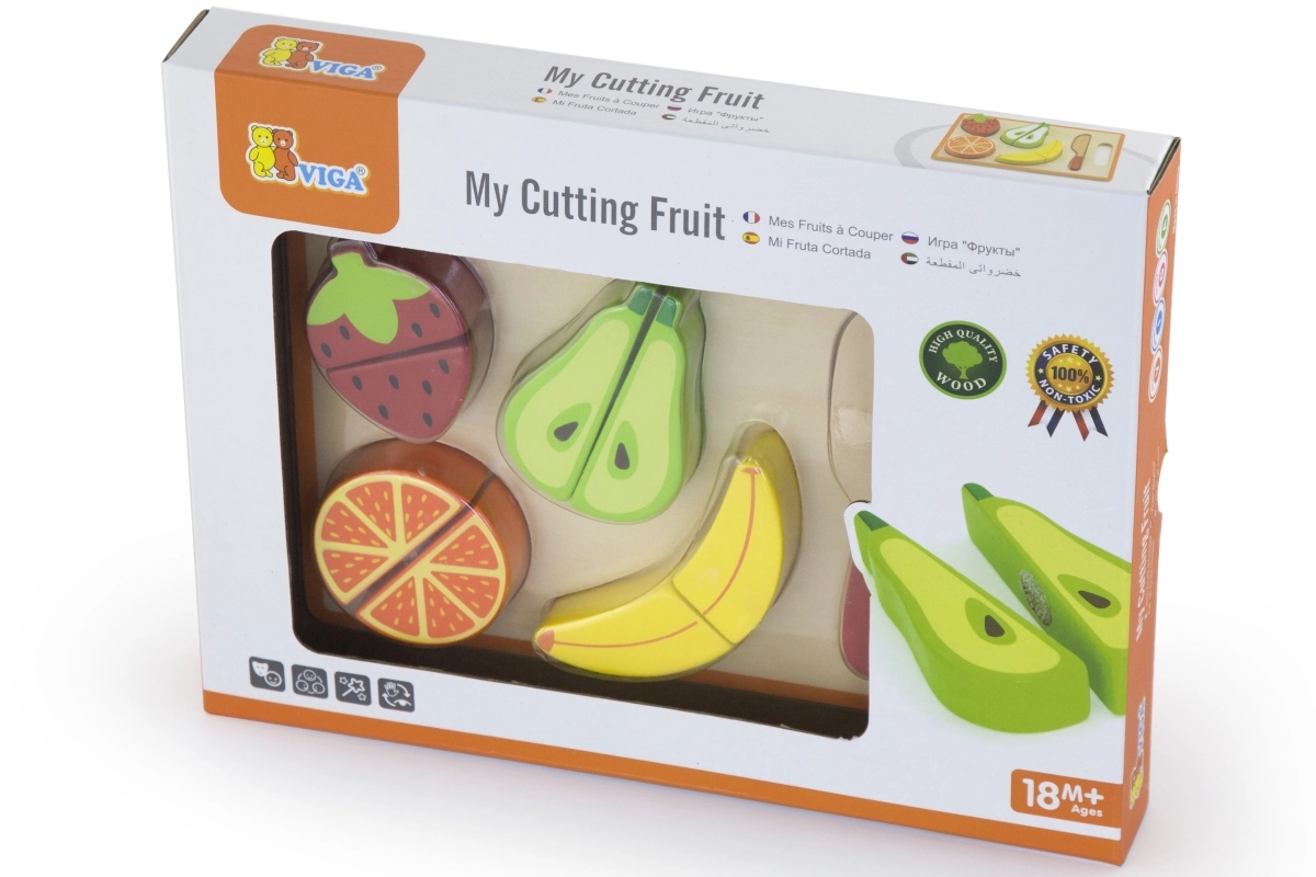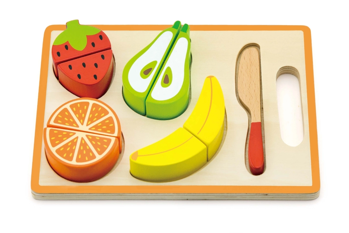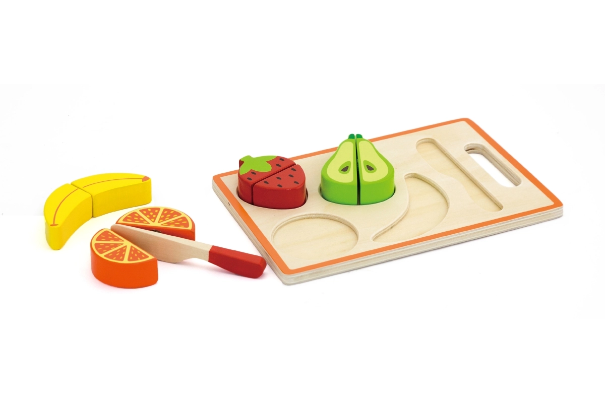 Ten wysokiej jakości drewniany zestaw zapewnia bezpieczną zabawę w gotowanie: poszczególne kawałki owoców są połączone rzepem, dzięki czemu dzieci mogą je wielokrotnie „kroić” i ponownie łączyć. Realistyczne wykonanie pomaga w nauce rozpoznawania kształtów i kolorów, ćwiczy chwyt i koordynację oraz rozwija wyobraźnię podczas zabaw w kucharza.
