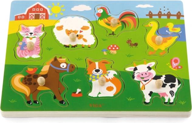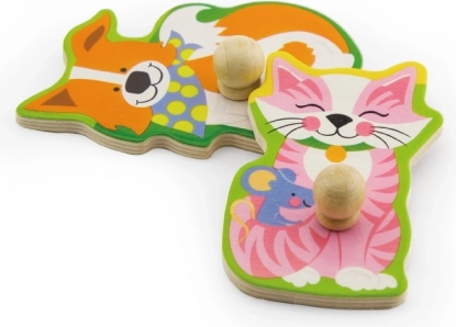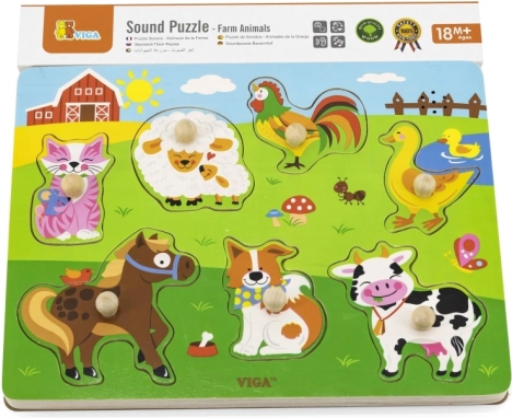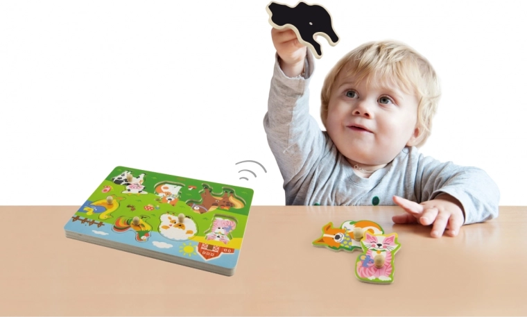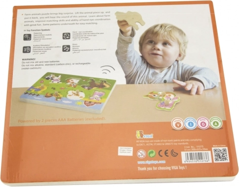 Drewniana układanka ze zwierzątkami, dźwiękowa. Po umieszczeniu właściwego zwierzątka rozlega się dźwięk, który to zwierzątko wydaje. Wymiary planszy ok. 30 × 22,5 × 2 cm. Zasilanie: 2 × bateria AAA (brak w zestawie). Wymiary opakowania ok. 30 × 27 × 2 cm. Wiek: 18m+.