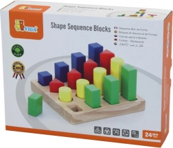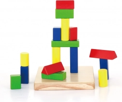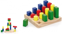 - drewniana podstawa z kołkami oraz zestaw kolorowych elementów geometrycznych