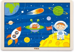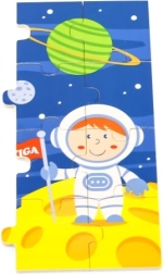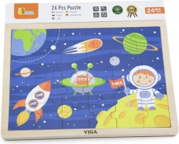 Drewniane puzzle VIGA z motywem kosmosu przynoszą dzieciom od najmłodszych lat radość z odkrywania. Kolorowe ilustracje z rakietą, astronautą i planetami naturalnie wspierają rozpoznawanie kształtów i kolorów oraz rozwój koordynacji oko–ręka. Ułożone puzzle mają wymiary ok. 27,5 × 20 cm, dzięki czemu świetnie mieszczą się na stole i w kąciku zabaw.