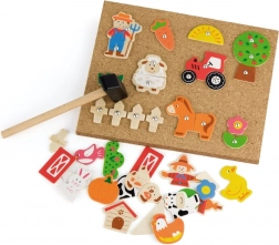Kreatywna korkowa tablica do wbijania z motywem farmy marki Viga rozwija małą motorykę, logiczne myślenie i kreatywność dzieci od 3 lat. Dzięki 24 drewnianym elementom, korkowej tablicy, małemu młoteczkowi i pinezkom dzieci tworzą własne scenki farmerskie według wyobraźni lub gotowych wzorów. Bezpieczne zaokrąglone krawędzie i trwałe wykonanie gwarantują mnóstwo zabawy i nauki.