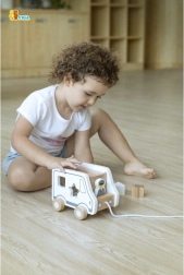 Ta drewniana zabawka do ciągnięcia w kształcie ciężarówki łączy dwie ulubione aktywności – ciągnięcie na sznurku i wkładanie kształtów. Dzieci rozwijają rozpoznawanie kształtów i percepcję przestrzenną, jednocześnie ciesząc się ruchem i zabawą wyobraźni z uroczym autkiem.