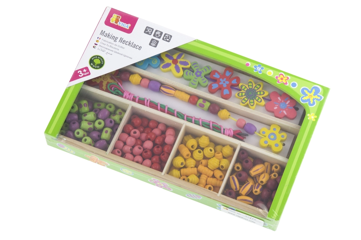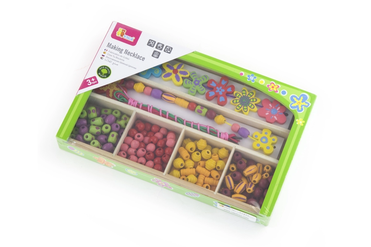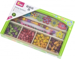 Ten drewniany zestaw koralików zapewni dzieciom godziny zabawy przy tworzeniu oryginalnych naszyjników i bransoletek. W pudełku znajdziesz kolorowe koraliki o różnych kształtach i rozmiarach, w tym kwiatowe ozdoby, oraz sznureczki do łatwego nawlekania. Dzięki przejrzystym przegródkom wybór koralików jest prosty, a tworzenie naturalnie wspiera koncentrację i twórczą ekspresję.