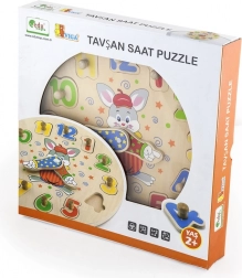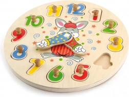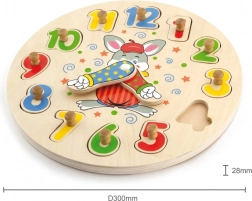 Zabawny i bezpieczny drewniany zegar edukacyjny, który pełni także funkcję układanki. Dzieci dzięki 12 kolorowym elementom z uchwytami ćwiczą liczby 1–12 oraz podstawy odczytywania czasu, rozwijają małą motorykę, myślenie logiczne i rozpoznawanie kolorów i kształtów. Średnica ok. 30 cm, odpowiedni od 24 miesięcy.