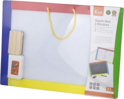 Ta uniwersalna tablica łączy dwie kreatywne powierzchnie w jednej – czarną magnetyczną stronę do kredy oraz białą suchościeralną stronę do markera. Dzieci mogą pisać, rysować i ćwiczyć literki oraz cyfry; na czarnej stronie dodatkowo łatwo przymocują magnesy. W zestawie znajdziesz wszystko do natychmiastowego użycia: 4 kredy, marker suchościeralny i gąbkę.