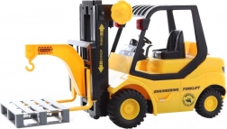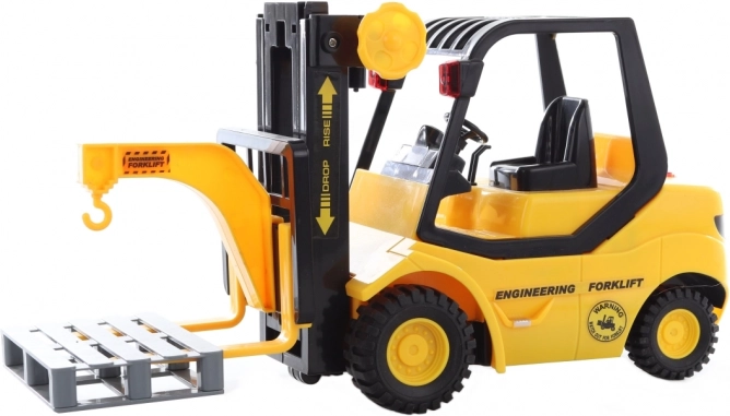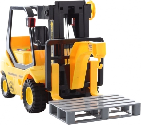 Realistyczny plastikowy wózek widłowy w skali 1:14 ucieszy małych budowniczych od 3. roku życia. Po naciśnięciu przycisku wydaje dźwięki i świeci, co wzmacnia realistyczną zabawę w magazyn lub na placu budowy. Zasilanie zapewniają 3× baterie AG13/LR44, które są dołączone do zestawu.
