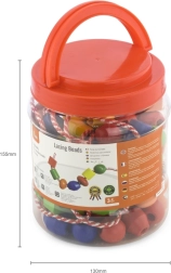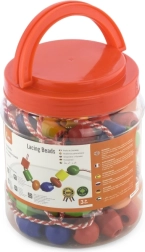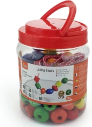 Plastowe pudełko zawiera duże drewniane koraliki oraz kolorowe sznurówki, na które można je nawlekać. Wymiary koralika ok. 2 × 2 cm w zależności od rodzaju. Wymiary opakowania ok. 16 × 12 cm. Zawiera 90 koralików i 5 sznurków. Wiek 3+.