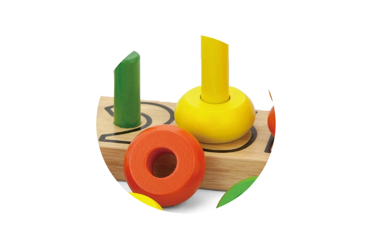 Stabilna drewniana podstawa oraz gładkie, bezpieczne elementy gwarantują długą trwałość i wygodne chwytanie małymi rączkami.