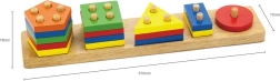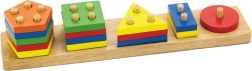 Ta solidna drewniana układanka łączy sortowanie i nakładanie kształtów na kołeczki. Dzieci uczą się rozróżniać kolory i figury geometryczne, ćwiczą koordynację ręka–oko oraz poprawiają zręczność podczas manipulowania elementami. Drewno jest gładko szlifowane, a kolory wyraziste i atrakcyjne.