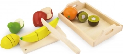 Owoce i nóż wykonane są z naturalnego drewna, co zapewnia bezpieczeństwo i trwałość podczas zabawy.
