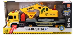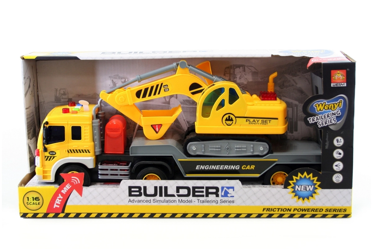 Odkryj dynamiczny budowlany zestaw, który ucieszy każdego małego miłośnika techniki. Duża ciężarówka z funkcjonalną uchylną platformą bezpiecznie przewiezie dołączoną koparkę na każdą dziecięcą budowę. Po naciśnięciu czterech przycisków na masce ciężarówka wydaje efekty dźwiękowe oraz sygnały świetlne, które potęgują realistyczne wrażenia z zabawy.