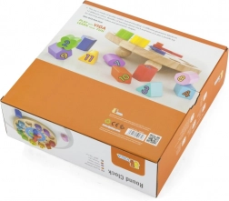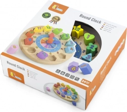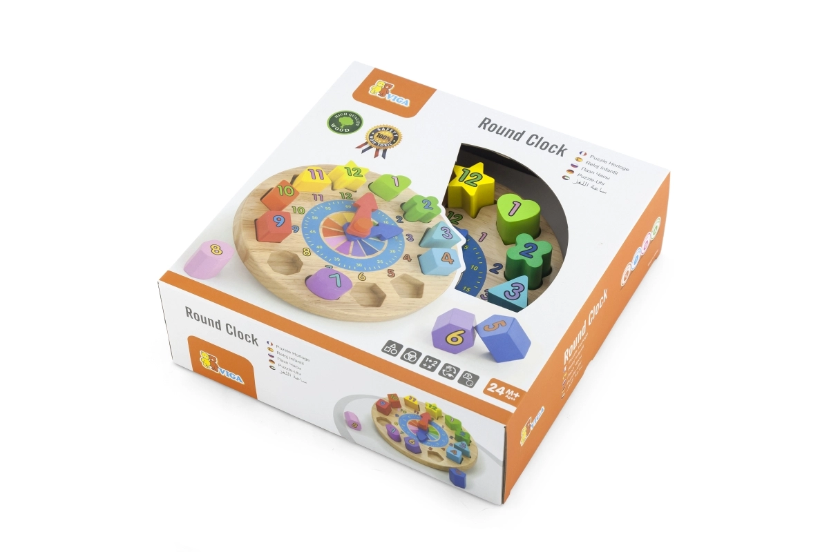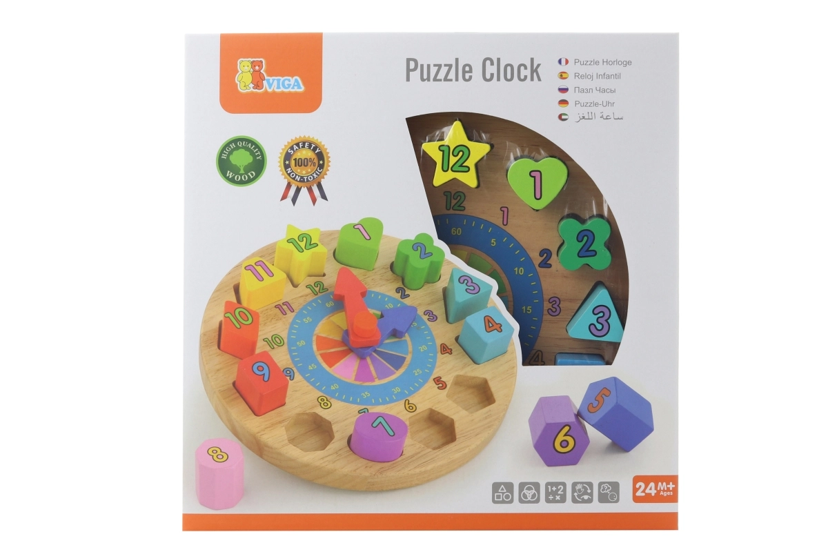 Zegar ma kompaktowe wymiary około 22 × 6 cm, a w zestawie znajduje się 12 różnych kształtów w żywych kolorach z oznaczonymi cyframi. Świetny pomocnik do pierwszego zapoznania z pojęciem czasu oraz do rozwoju cierpliwości i koncentracji.
