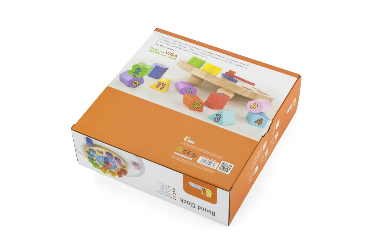 Zabawny i edukacyjny drewniany zegar dla najmłodszych pomaga uczyć się rozpoznawać czas, kolory i kształty. Zawiera 12 kolorowych elementów do układania z cyframi, które rozwijają małą motorykę, logikę i koordynację oko–ręka. Idealna zabawka dla dzieci od 24 miesięcy.