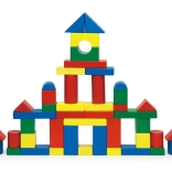 Drewniane klocki o różnych kształtach i rozmiarach pozwalają tworzyć rozmaite konstrukcje, takie jak domy, wieże lub mosty.