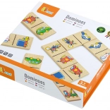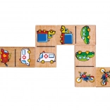 Domino wykonane jest z wysokiej jakości drewna, co zapewnia jego trwałość i bezpieczeństwo podczas zabawy. Każdy element ma wymiary około 7 x 3,5 x 0,5 cm, co jest idealne dla małych rąk dzieci.