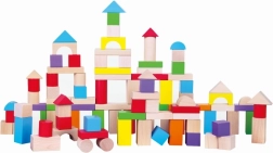 Klocki w formie prostopadłościanów, kostek, walców i łuków (wielkość 2,5–7,5 cm) inspirują do tworzenia wież, mostów i całych miasteczek.