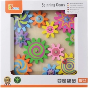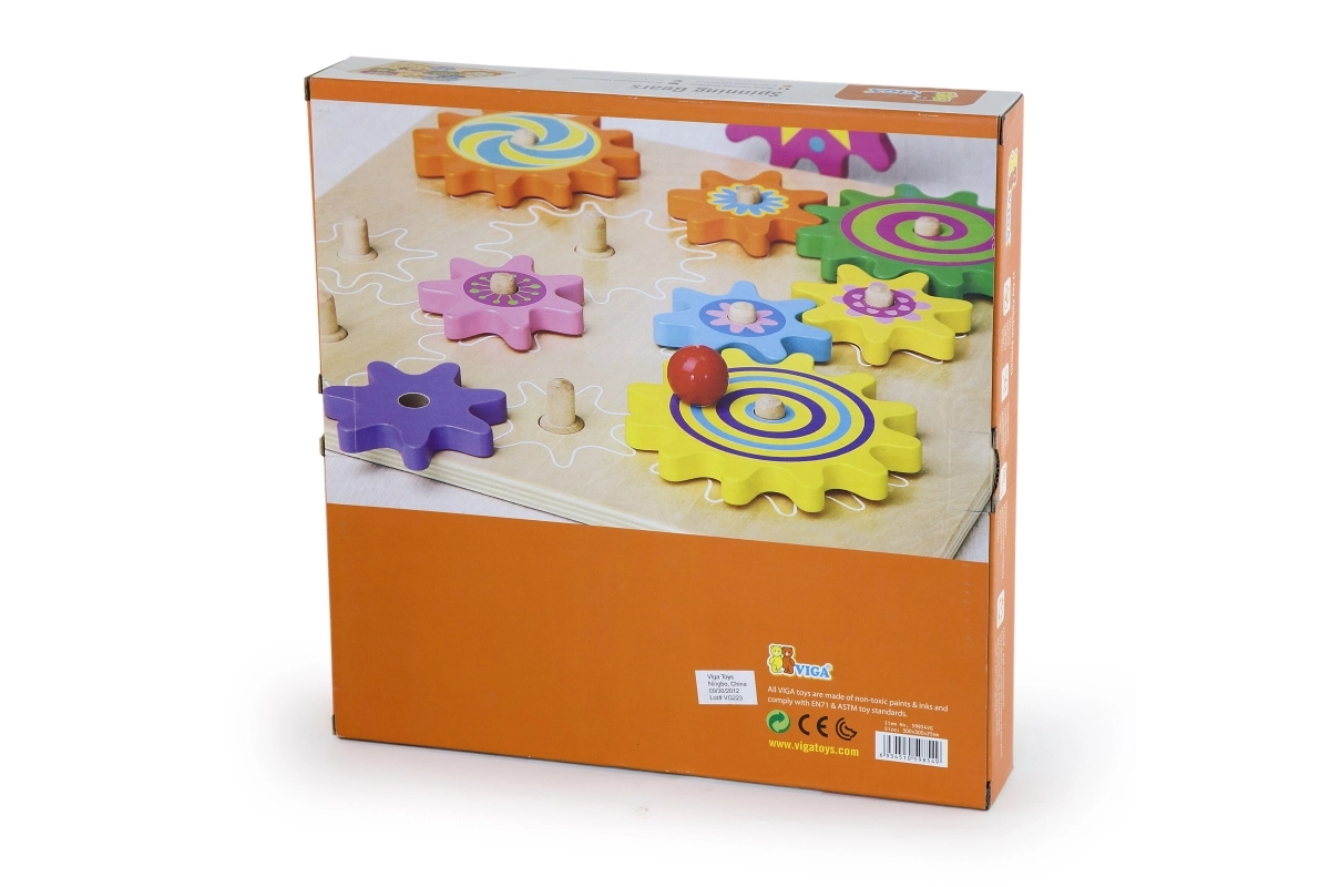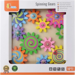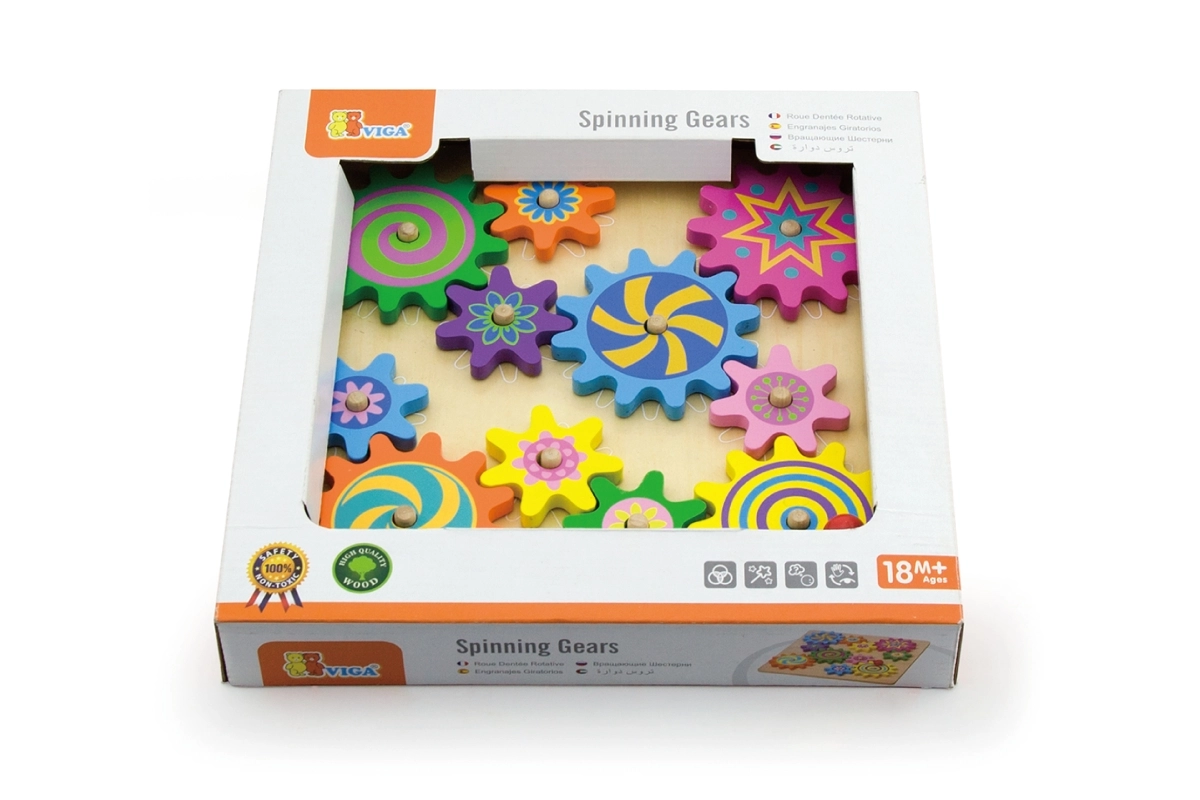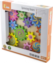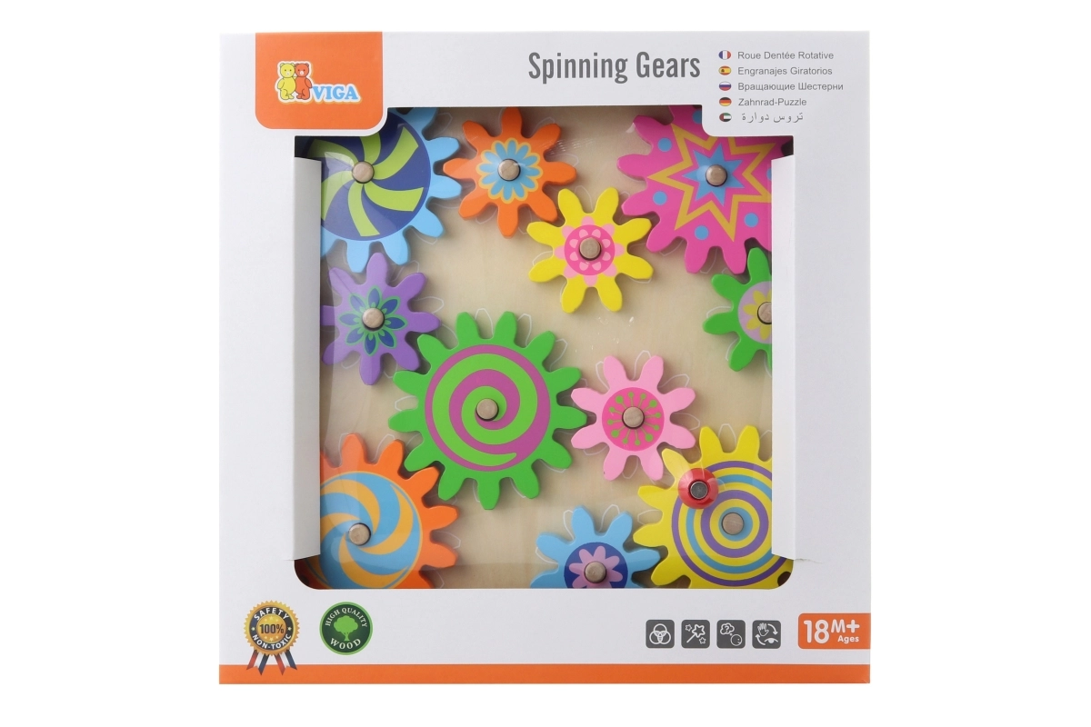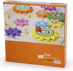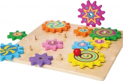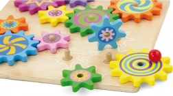 Ten kolorowy zestaw drewnianych zębatych kółeczek na stabilnej podstawie ucieszy małych odkrywców. Dzieci umieszczają kółeczka na kołkach, testują ich połączenia i obserwują, jak po obróceniu jednego kółeczka wszystkie płynnie zaczynają się poruszać. Zabawka wspiera koordynację ręka–oko, myślenie logiczne oraz naukę przyczyny i skutku.