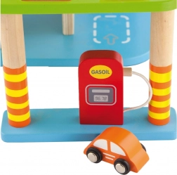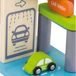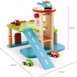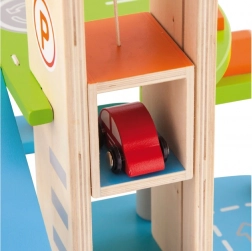 Ten wysokiej jakości drewniany garaż oferuje wielopoziomowe parkowanie, lądowisko dla helikoptera oraz praktyczną windę do łatwego przemieszczania autek między piętrami. Dzięki przemyślanemu projektowi z drogami, znakami i dodatkami dzieci ćwiczą koordynację ruchową i rozwijają wyobraźnię.
