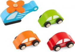 W zestawie znajdują się 3 drewniane autka oraz helikopter, więc można zacząć zabawę od razu po rozpakowaniu. Bezpieczne, zaokrąglone kształty i trwałe materiały są idealne do codziennego użytkowania.