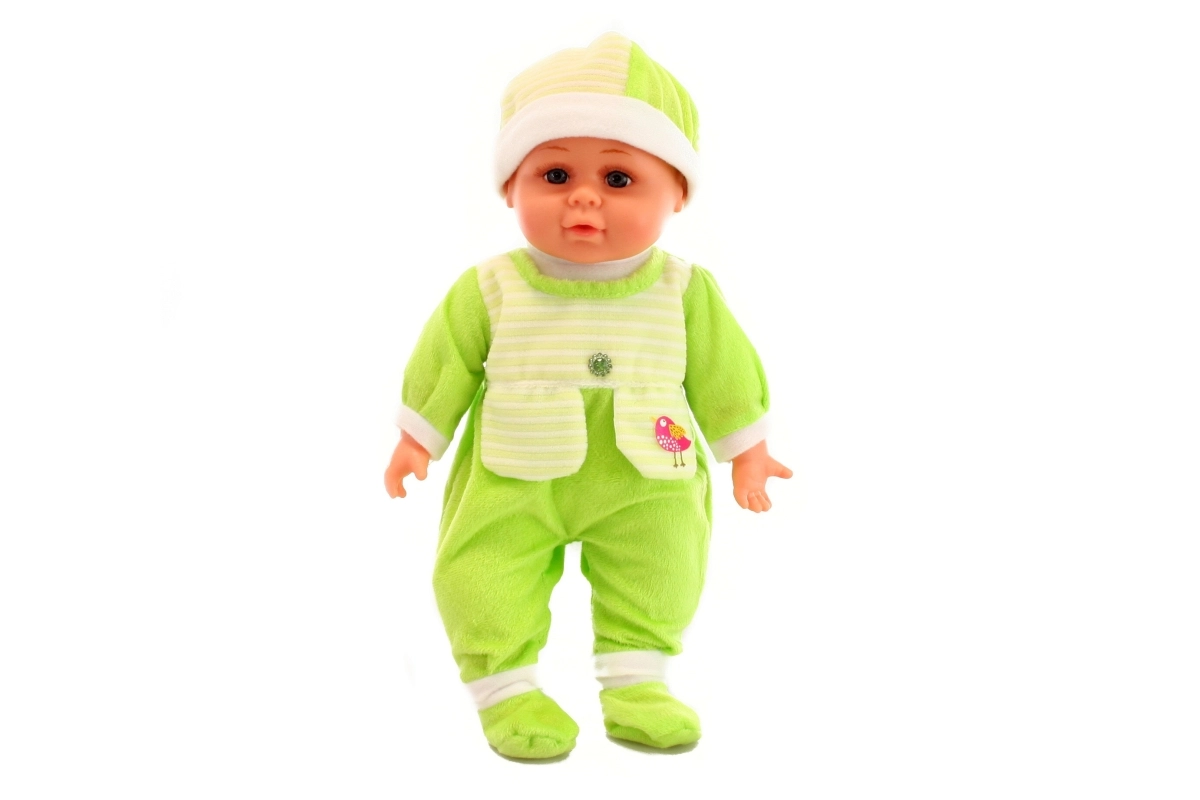 Uroczy dzidziuś z mięciutkim ciałkiem ucieszy każdego małego opiekuna. Po naciśnięciu ciałka wydaje realistyczne dźwięki – śmiech, płacz, „mama” i „tata”. Lalka jest ubrana w kolorową piżamkę zapinaną na rzep, którą można łatwo zdjąć i ponownie ubrać.