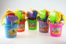 Zestaw do piasku z obrazkiem – wiaderko, łopatka, grabki i konewka