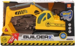 Koparka na baterie o wymiarach ok. 24 × 12 cm. Wymiary opakowania ok. 25 × 10 × 14 cm. Zasilanie 3× bateria AG13 (w zestawie). Koparka wydaje dźwięki i świeci. Wiek 3+