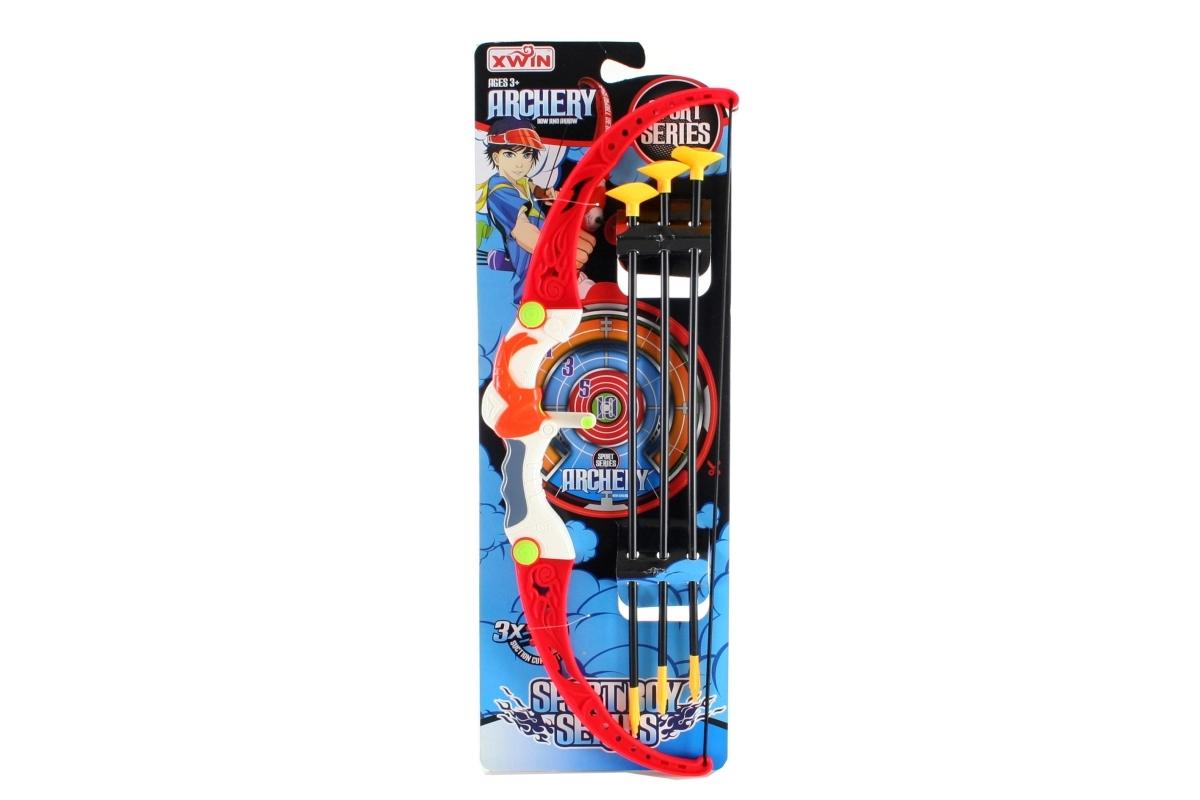 - Łuk, 3 strzały z przyssawkami, karta z wycinaną tarczą