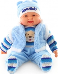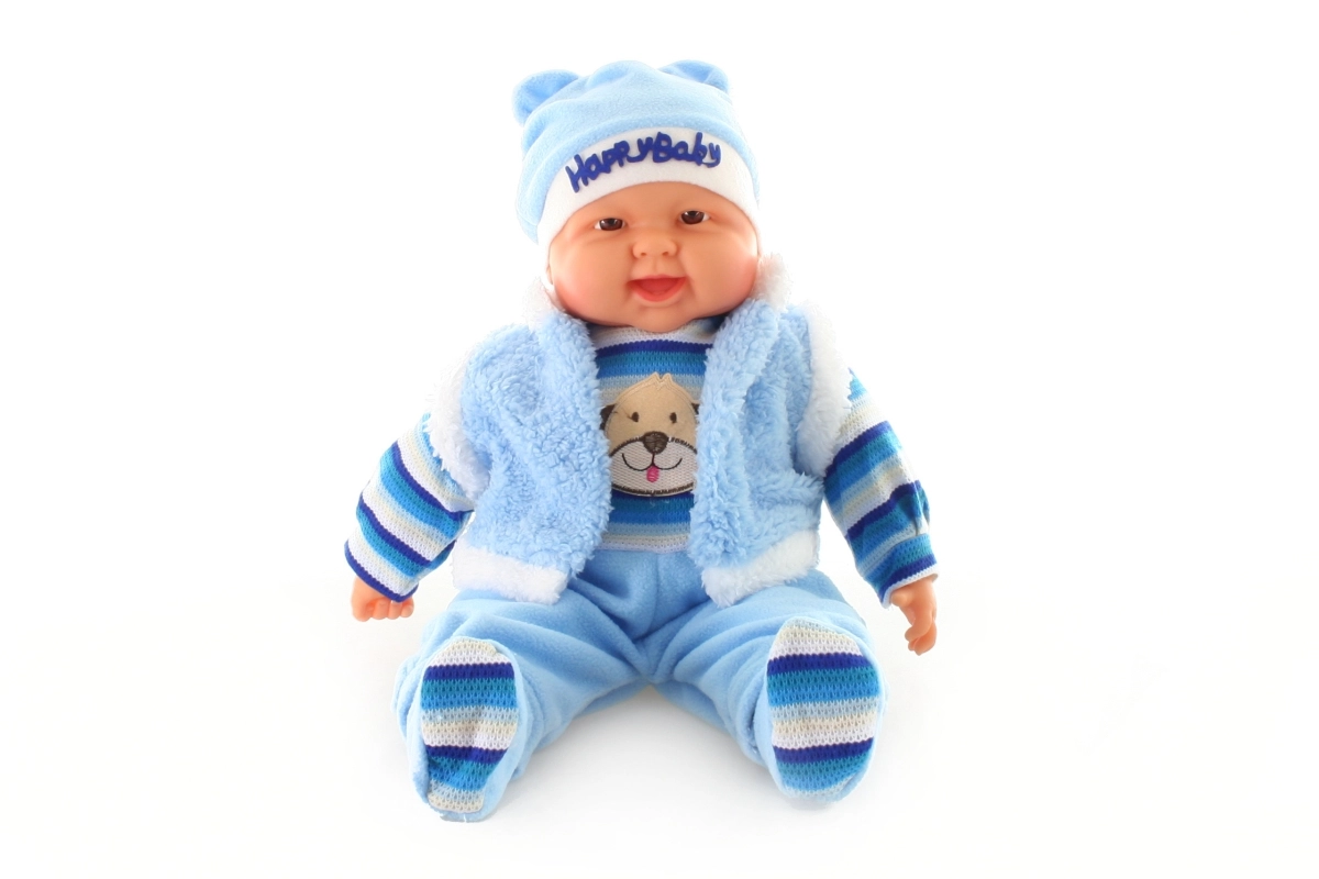 Duża lalka – niemowlę, chłopiec – z miękkim ciałem, o wymiarach ok. 53 × 30 × 13 cm. Ubranko można zdjąć. Zapakowana w woreczek. Wiek 3+