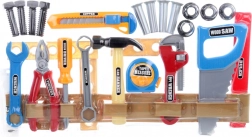 Piłka, szczypce, młotek, klucz nastawny, śrubokręt, klucz, nożyk i pas na narzędzia – wszystko przejrzyście w jednym miejscu do realistycznej zabawy.