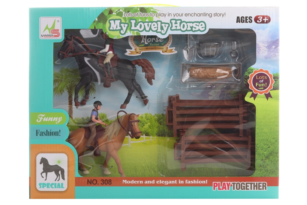 - Kompletny zestaw – 2 konie, 2 jeźdźców, zagroda i dodatkowe akcesoria.
