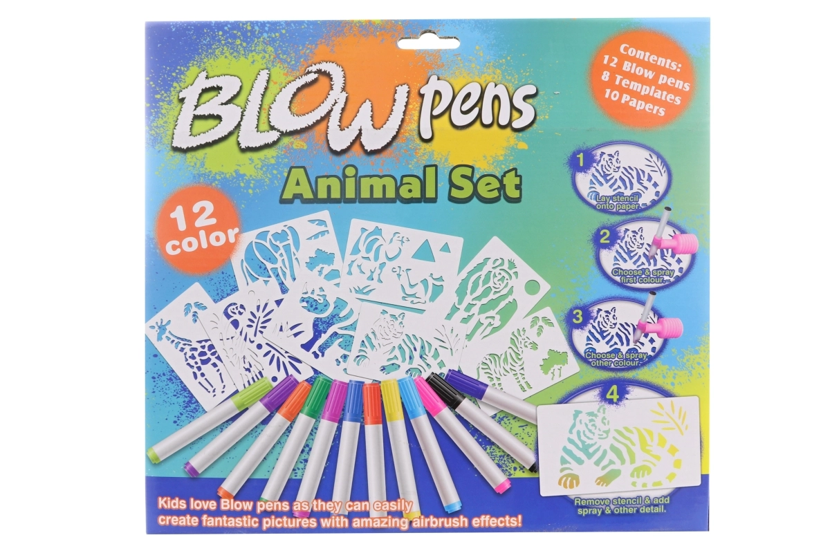 Odkryj radosne tworzenie z kreatywnym zestawem dmuchanych flamastrów w motywie safari. Duży zestaw zawiera 12 kolorowych flamastrów, 8 szablonów, 6 arkuszy papieru, praktyczną kartonową podstawkę z uchwytem oraz nakładkę do dmuchania z pompką dla łatwego i czystego tworzenia. Idealny dla dzieci od 3 lat.