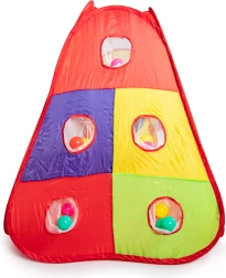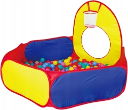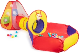 Zabawny zestaw do zabawy dla dzieci z kolorowym namiotem, tunelem i suchym basenem na piłeczki do zabawy w domu i w ogrodzie. W zestawie znajduje się 100 kolorowych piłeczek, kosz do rzucania oraz ścianki z tarczami z 3 piłeczkami z rzepem. Konstrukcja samorozkładająca, szybki montaż i lekka, poliestrowa powłoka gwarantują łatwe użytkowanie i długie godziny aktywnej zabawy.