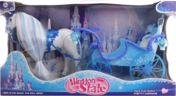 Konik z niebieskim powozem. Po włożeniu baterii konik chodzi, gra, a na powozie świecą latarenki. Zasilanie na 2 baterie AA (nie są dołączone do zestawu). Wymiary opakowania ok. 56 × 30 × 19 cm. Wiek 3+