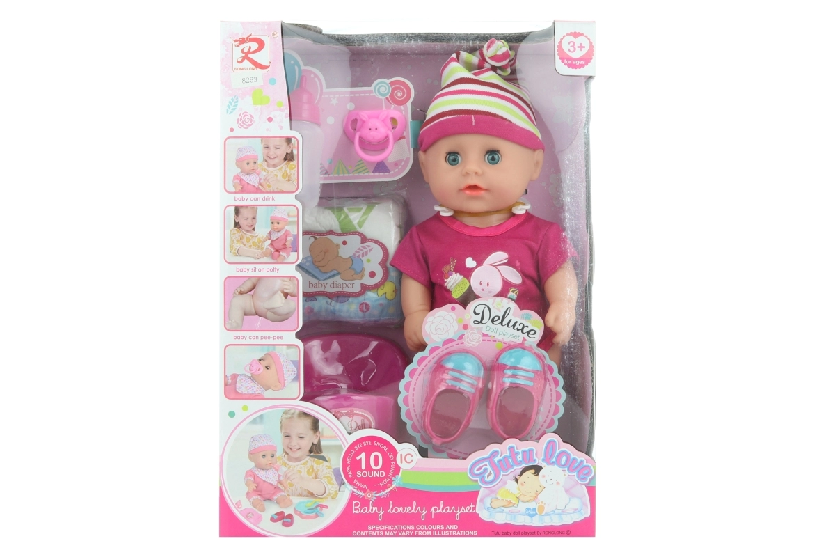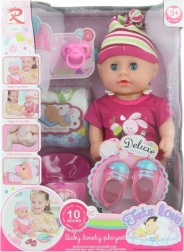 Uroczy dzidziuś o wielkości 30 cm, który po włożeniu baterii wydaje realistyczne dźwięki i potrafi sikać. W zestawie znajdziesz bogaty komplet akcesoriów, w tym buciki, plastikowy śliniaczek, butelkę i talerzyk. W zestawie są również baterie, więc dzieci mogą bawić się od razu po rozpakowaniu.