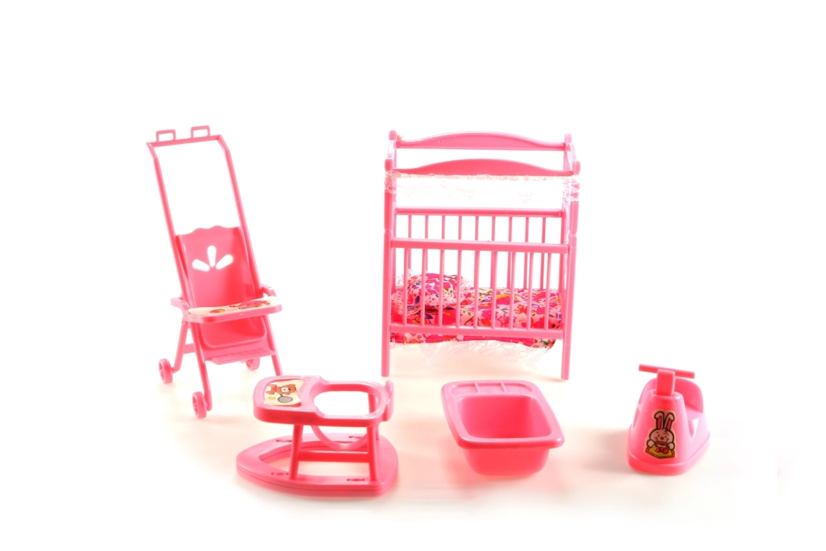 Kompletny zestaw do dziecięcego pokoiku dla lalek GLORIE ucieszy każdego małego opiekuna. Znajdziesz w nim łóżeczko z kołderką i poduszeczką, wózek, chodzik, nocnik oraz wanienkę – wszystko z wytrzymałego plastiku i w rozmiarach idealnych do zabawy. Świetny do rozwijania wyobraźni i zabawy w odgrywanie ról. Odpowiedni od 3 lat.