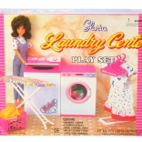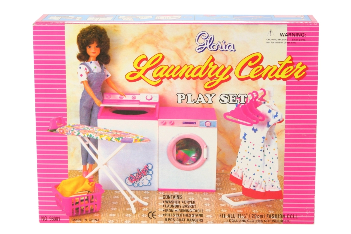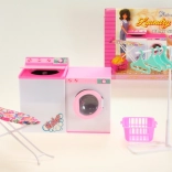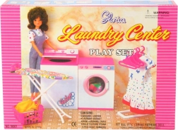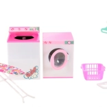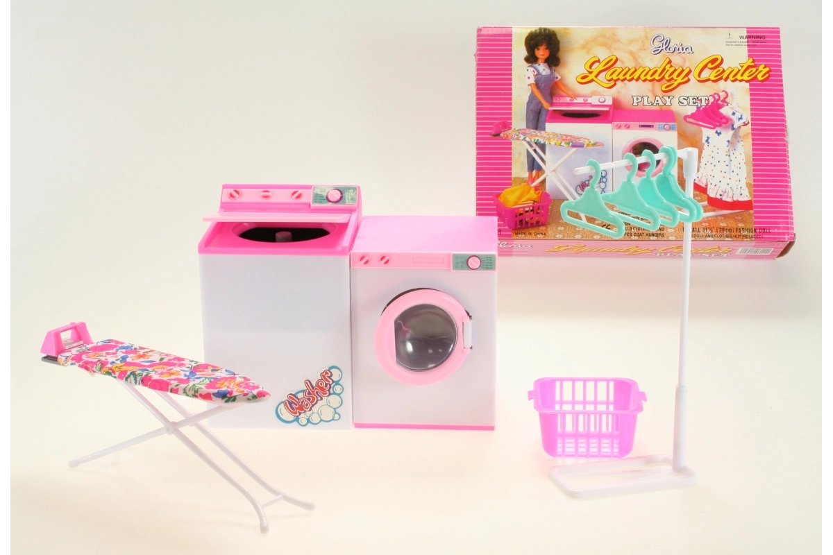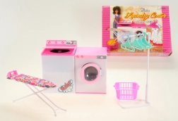 - Zawartość zestawu: pralka (otwierane przednie drzwiczki), suszarka (otwierana górna pokrywa), deska do prasowania, żelazko dla lalek, stojak na ubrania z 5 wieszakami, koszyk na pranie