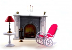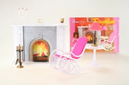 - Plastikowy kominek, świecznik, obrazek, zegar, fotel bujany, stolik z lampą, stojak z akcesoriami do kominka